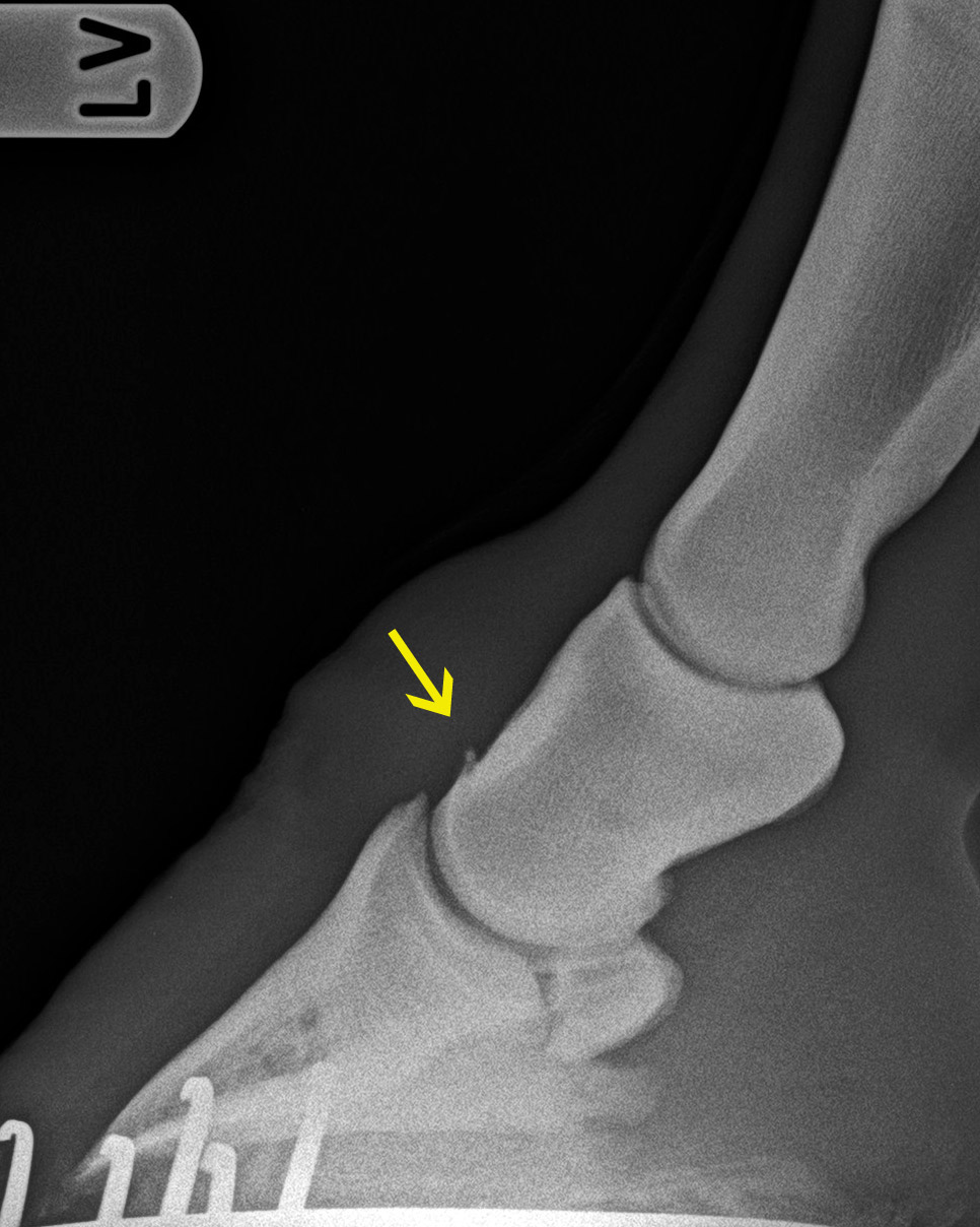 Verknöcherung am Ansatz der Hufgelenkskapsel (gelber Pfeil)