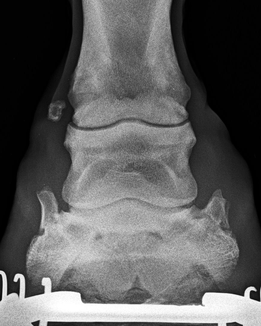 Höchstgradige Krongelenksarthrose mit isolierter Verknöcherung innen (wie auf folgender Aufnahme)