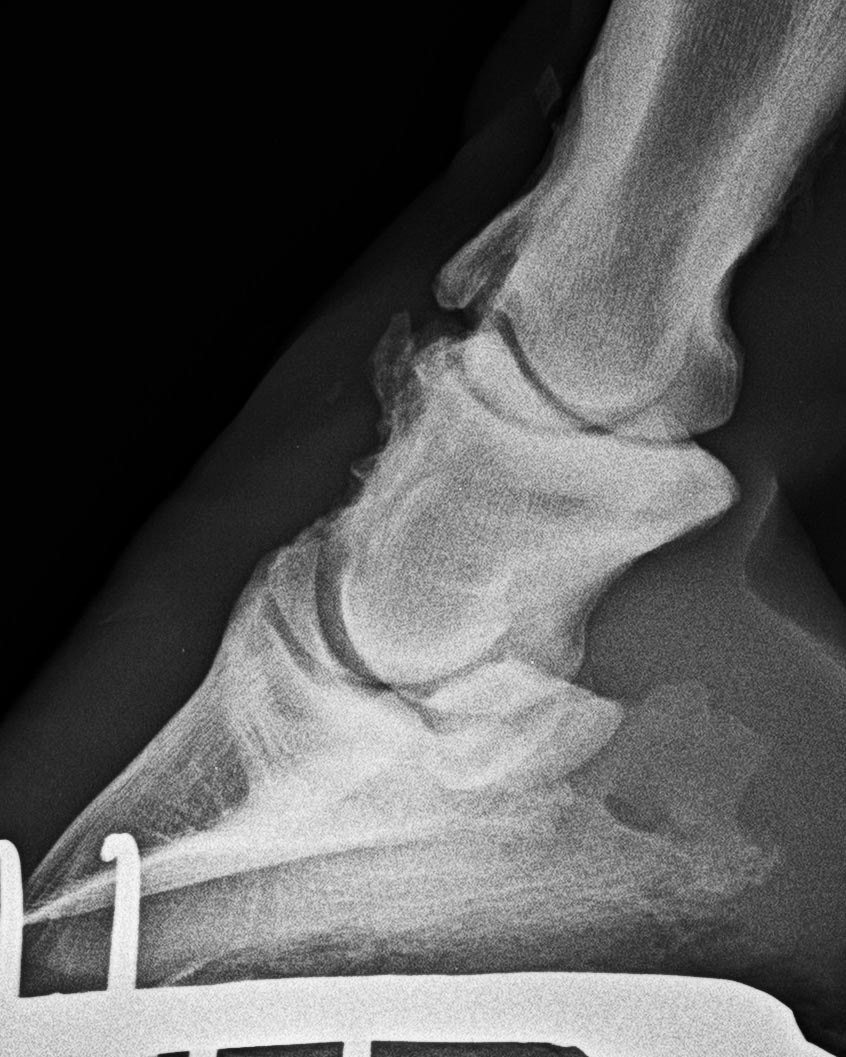 Höchstgradige Krongelenksarthrose (wie im Bild zuvor) Aufnahmerichtung ca. 80°