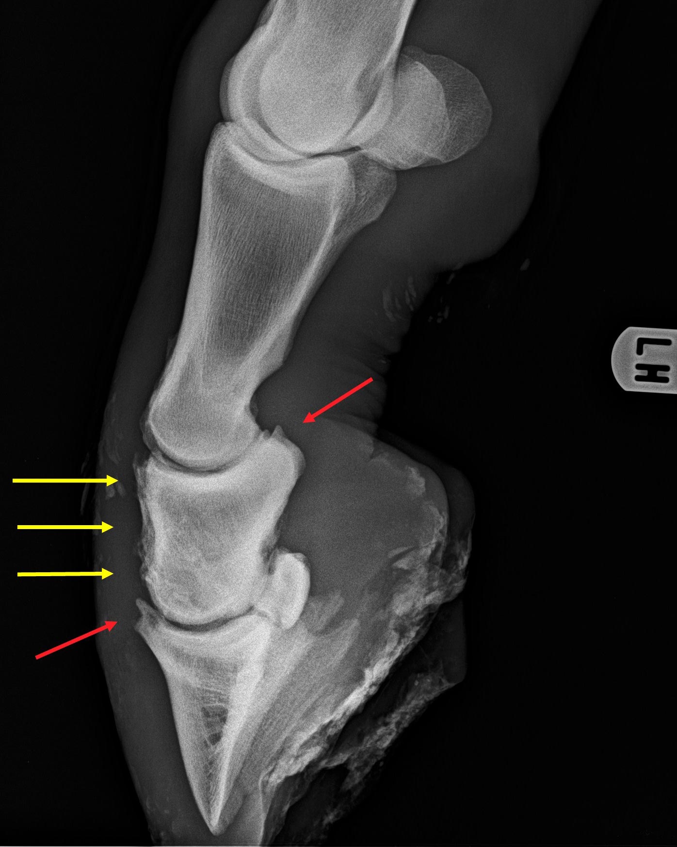 Kron- und Hufgelenkarthrosen (rote Pfeile) und knöcherne Zubildungen auf dem Kronbein (gelbe Pfeile)