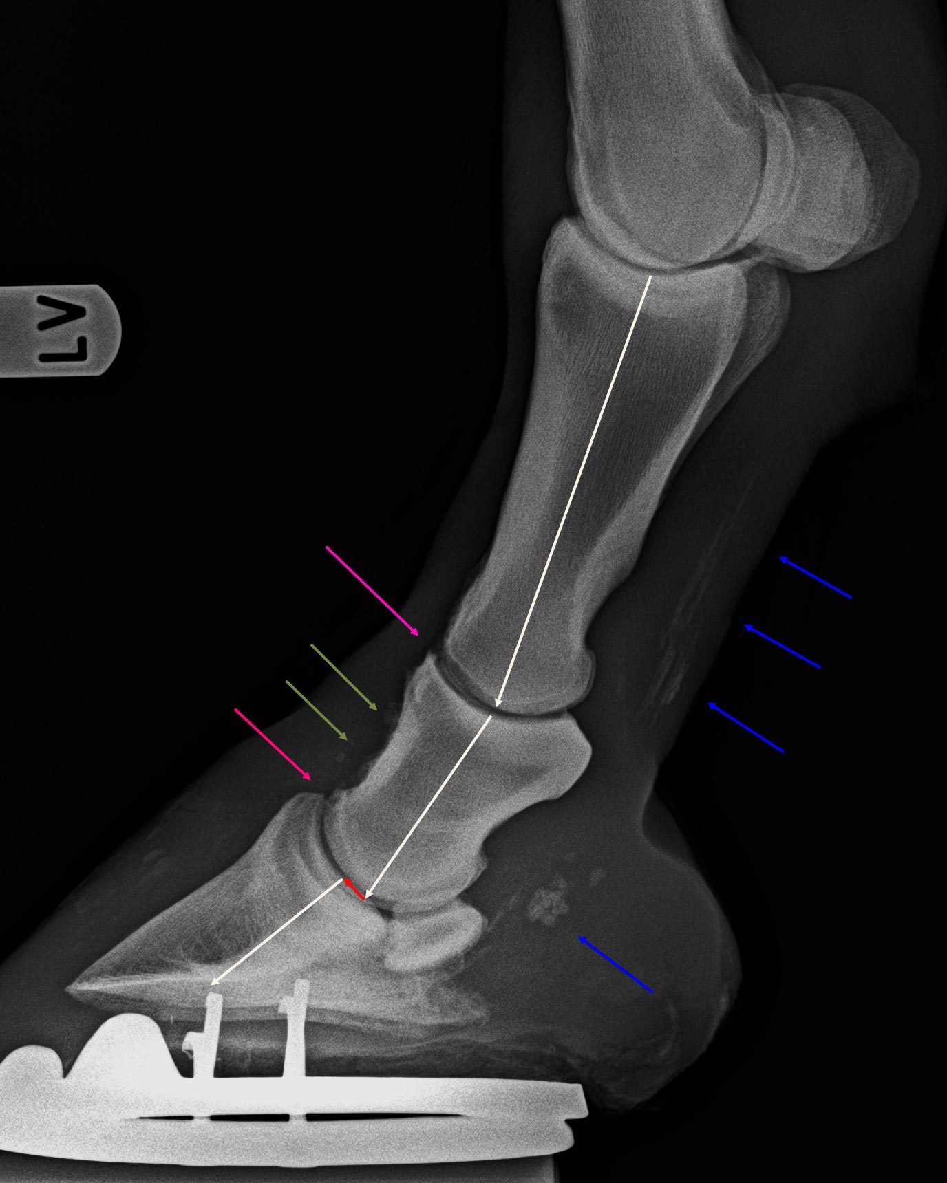 Sehnenverkalkungen (blaue Pfeile), geringgradige Kron- und Hufgelenksarthrose (violette Pfeile),