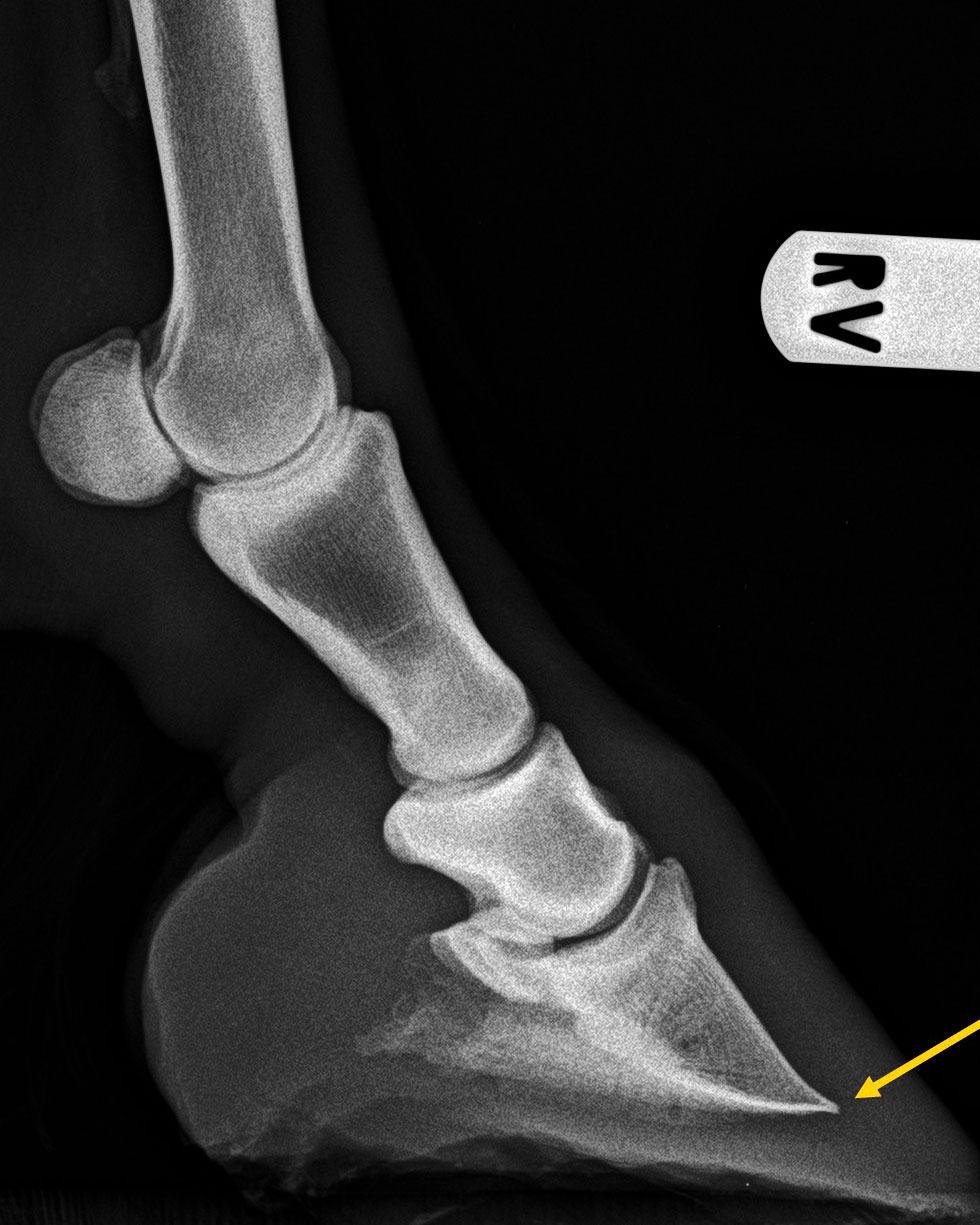 Verformung der Hufbeinspitze infolge einer Hufrehe wird als Huftkrempenbildung (gelber Pfeil) bezeichnet.